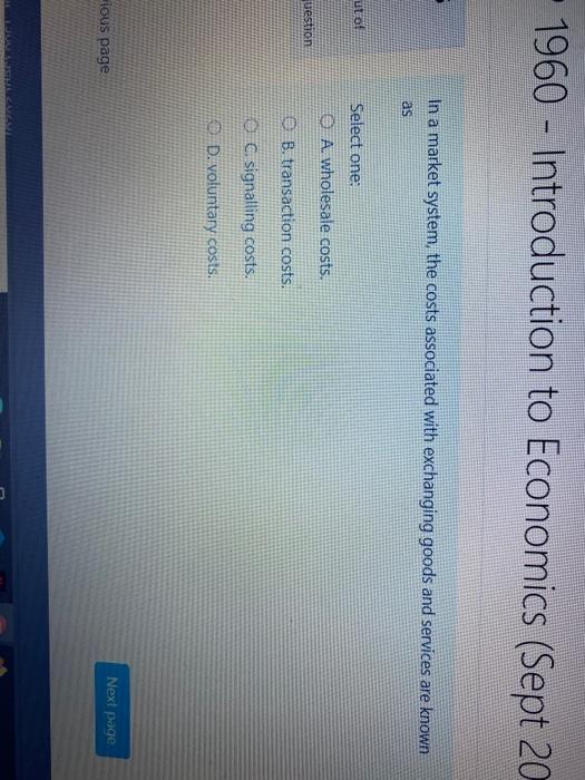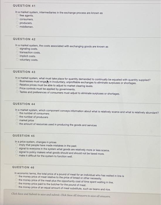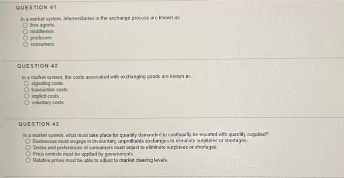 In a market system the costs associated with exchanging goods are known as A voluntary costs. QUESTION 41 In a market system intermediaries in the exchange process are known as free agents middlemen O producers consumers QUESTION 42 In a market system the costs associated with exchanging goods are known as signaling costs transaction costs implicit costs voluntary costs QUESTION 43 In a market system what must take place for quantity demanded to. In a market system intermediaries in the exchange process are known as.